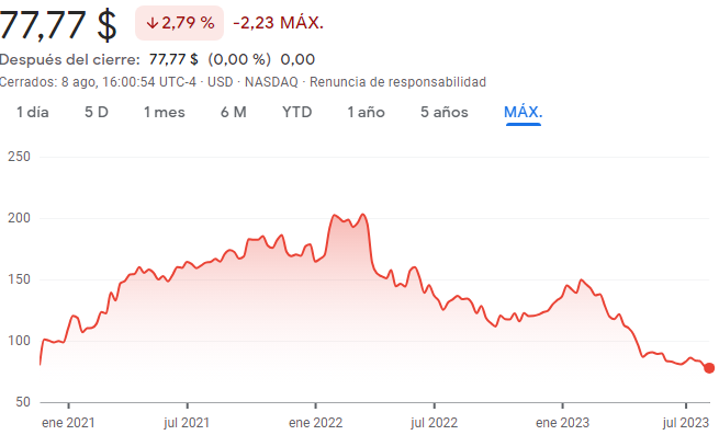 Desde el 2006, Concentrix fue una subsidiaria de SYNNEX Corporation, la cual decidió sacarla a bolsa a partir del 2020; como podemos ver en el grafico, su precio se encuentra actualmente por debajo del precio inicial de salida a bolsa.
